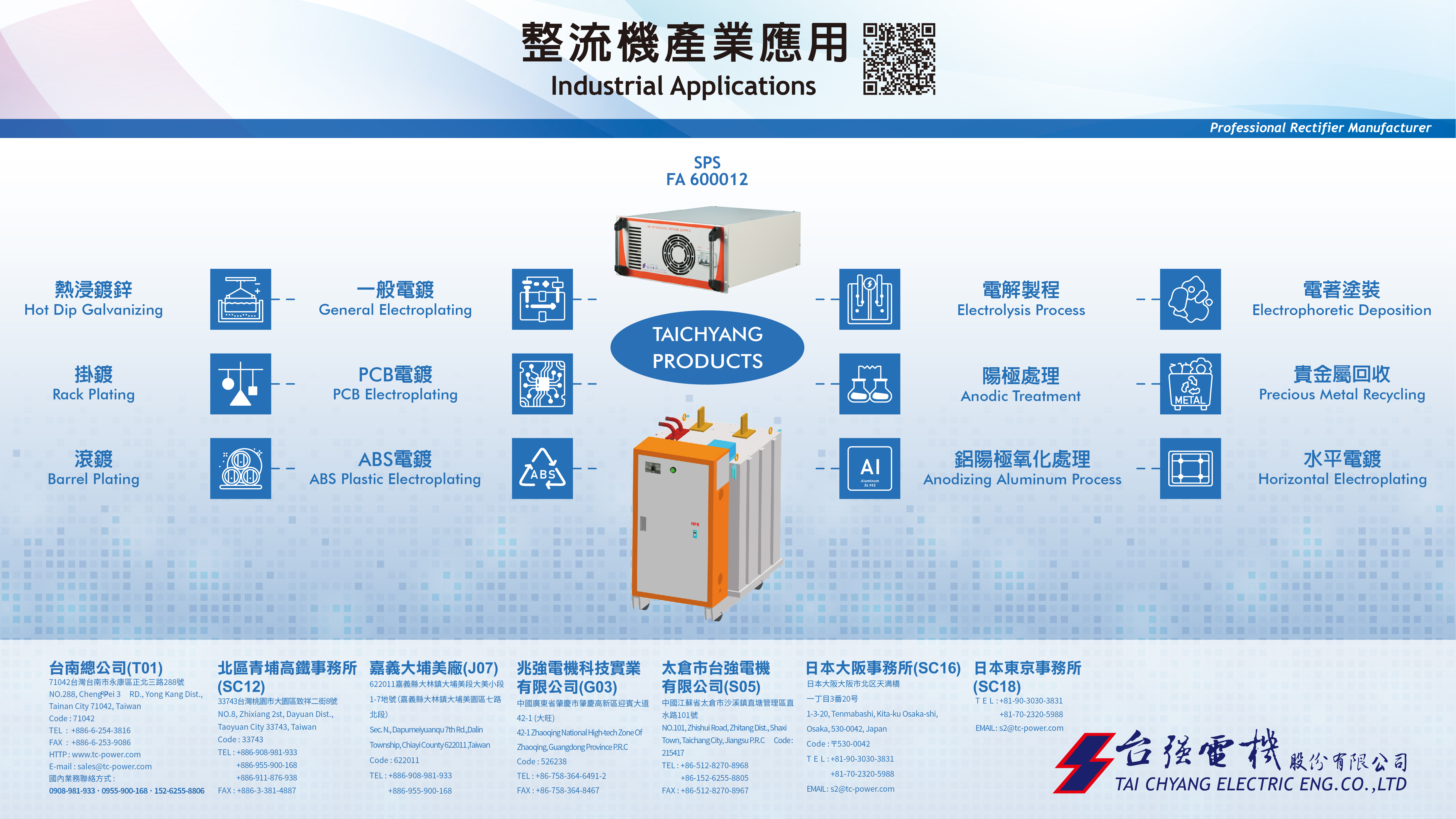 專(zhuān)業(yè)整流機(jī)製造 電鍍/電解 /陽(yáng)極/PCB/鍍金/鍍銀 臺(tái)灣整流機(jī)最大規(guī)模製造廠(chǎng) 整流器の専門(mén)メーカー 整流器專(zhuān)業(yè)製造廠(chǎng) 矽控整流器(Silicon Controlled Rectifier) IGBT Controlled Rectifier 表面處理種類(lèi)整流器 Power supply 熱浸鍍鋅整流器 hot dip galvanizing Power supply ABS塑膠電鍍整流器 Abs plastic electroplating Power supply 電鍍整流器 Electroplating power supply 掛鍍整流器 Rack Plating Power supply 滾鍍整流器 Barrel Plating Power supply 電鍍整流器 Electroplating Power supply 電解整流器 Electrolysis, Electric Analysis Power supply 陽(yáng)極處理整流器 Positive Electrode Power supply 鋁陽(yáng)極氧化處理整流器 Anodizing Aluminium Process Power supply 電著塗裝整流器 Electrophoretic Deposition Power supply 貴金屬回收整流器 precious metal recycling power supply 水平電鍍 Horizontal PCB電鍍 Printed circuit board 矽控整流器(Silicon Controlled Rectifier) 油水冷式 Oil water Cooling 風(fēng)冷式 Air cooling 風(fēng)水冷式 Air water Cooling